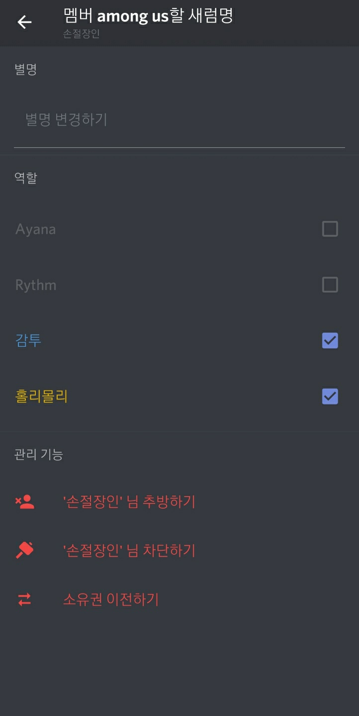 해당멤버를 누르면 위와 같이 멤버에 대한 상세 화면이 나옵니다. 개인 메세지, 전화, 영상통화 등이 가능하며 방에서 추방하기, 차단하기가 가능하고 역할 및 소유권 이전을 위해서는 사용자 관리하기로 넘어가야 합니다. 현재 감투라는 역할을 부여하였기 때문에 하랑색 역할이 부여됐으며 닉네임도 파란색으로 표기되지만 역할을 빼앗으면 일반 사용자와 같아집니다. 우측 체크 박스를 해제하면 역할이 사라지며 여러가지 역할을 만들어서 중복으로 역할을 부여해도 아무 이상이 없다는 것을 확인 했습니다. 역할을 크게 주지 말고 여러가지 조금씩 부여하여 중복 역할을 주는 것도 굉장히 좋네요. 약간 css 속성 같은 느낌도 들고 디스코드 자체의 봇들도 그렇고 코드라는 느낌이 강하게 드는 프로그램입니다.