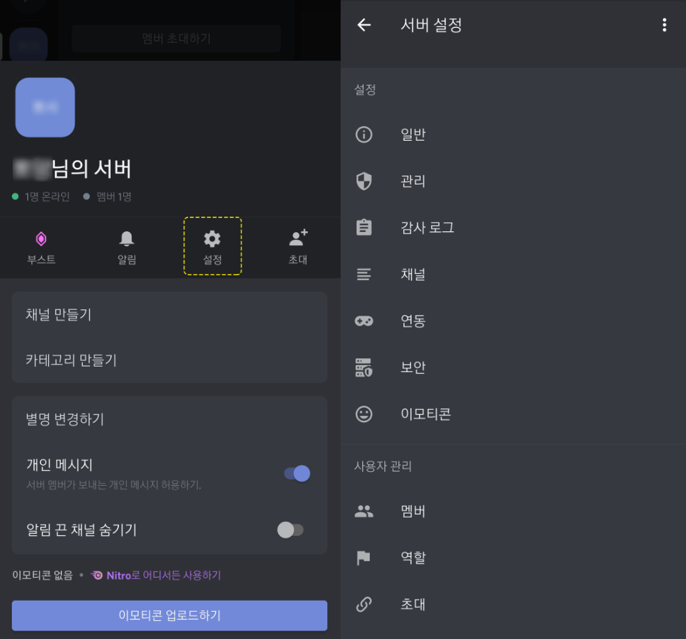 서버가 생성 된 것을 알 수 있습니다. 멤버 초대하기에 앞서 서버의 기본 설정을 변경해보겠습니다. 우측 상단의 멤버초대하기 옆에 점 3개가 세로로 나란히 있는 아이콘을 확인 하실 수 있습니다. 아이콘을 누르면 우측 화면과 같이 서버를 관리할 수 있는 창이 나옵니다.