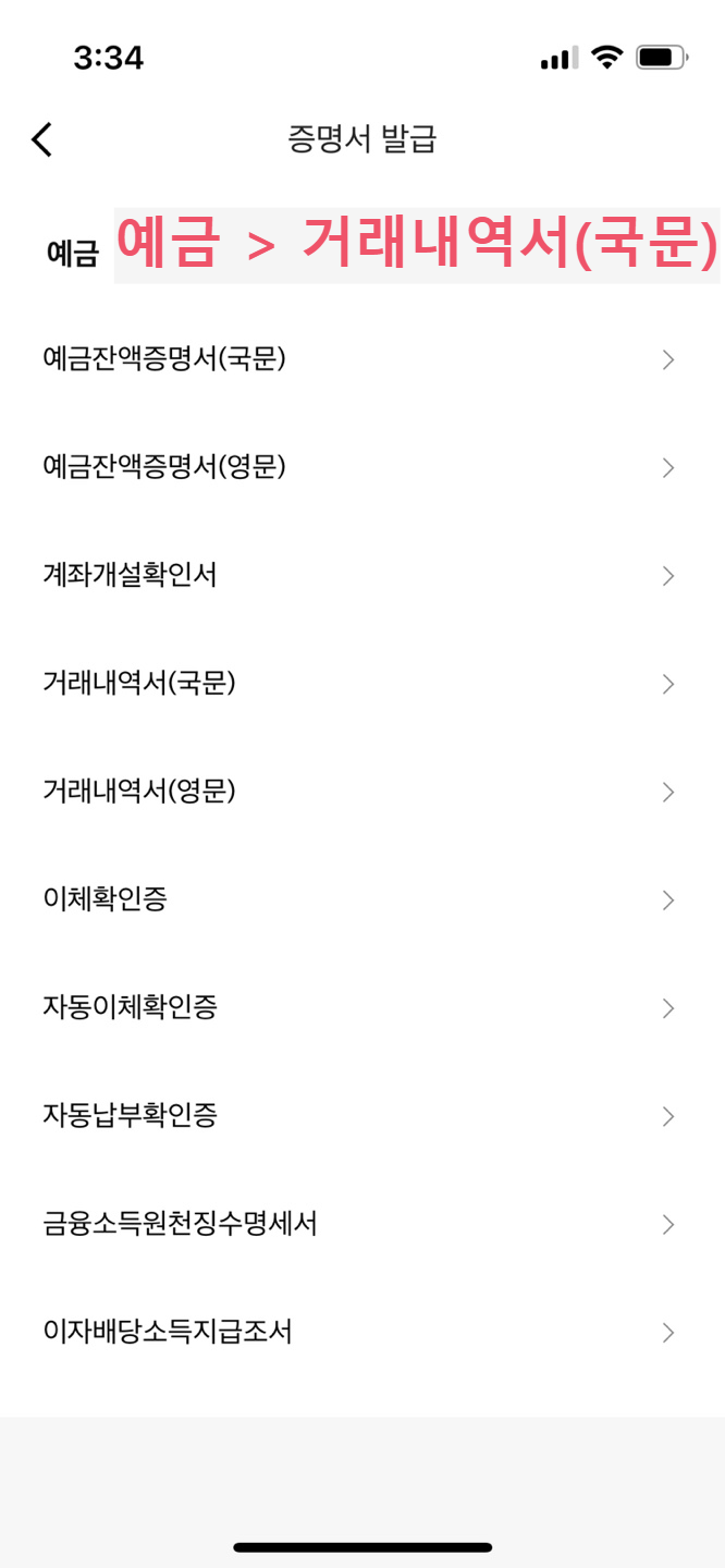 3. 예금 > 거래내역서 선택